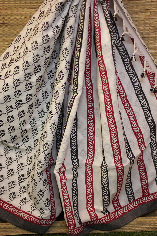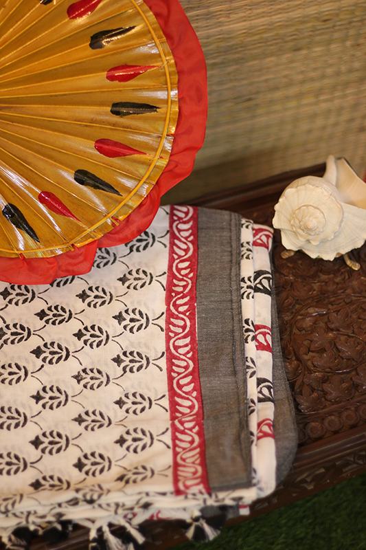 This exquisite saree is a testament to the artistry of Bengal’s artisans, who have meticulously block-printed geometric motifs in striking shades of red and black on a pristine white canvas. The bold yet balanced interplay of colors creates a visually captivating piece that is both modern and rooted in tradition. The geometric patterns, carefully aligned and hand-printed, reflect the precision and creativity of the craftsmen, resulting in a saree that stands out for its elegance and contemporary flair. Its lightweight fabric makes it easy to drape, ensuring comfort without compromising on style. Whether worn for a casual outing or a festive occasion, this saree embodies a perfect blend of simplicity and sophistication, making it a versatile addition to any wardrobe.