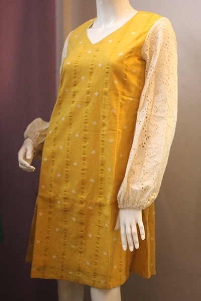 The dress is a vibrant yellow tunic with a V-neckline, featuring subtle white geometric patterns arranged in vertical stripes across the main fabric. The standout element is its full, slightly puffed white hakoba sleeves, which contrast beautifully with the solid yellow, adding a delicate and feminine touch to the overall design. This combination of bold color and intricate detailing creates a stylish and versatile outfit suitable for various occasions.