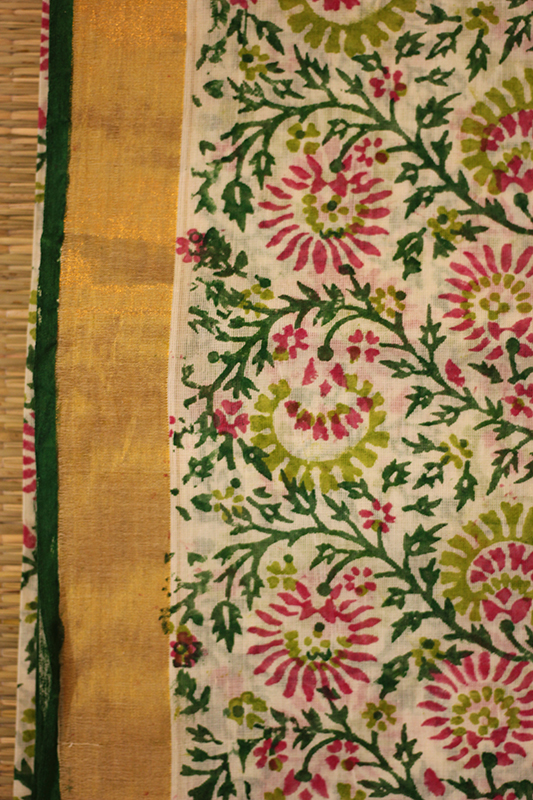 A Kasavu dupatta, renowned for its traditional elegance with its signature golden border, is transformed into a breathtaking masterpiece with the addition of striking floral patterns. The classic Kasavu design, which usually features a simple yet refined golden edge, is enhanced by vibrant, intricately printed floral motifs that infuse the dupatta with a fresh, modern sensibility. These floral patterns, whether they are delicate and detailed or bold and abstract, contrast beautifully with the timeless golden border, creating a harmonious blend of tradition and contemporary artistry. The end result is a dupatta that not only preserves the cultural charm of Kasavu but also showcases a vibrant, artistic flair, making it a stunning accessory that elevates any outfit with its sophisticated and visually captivating design.