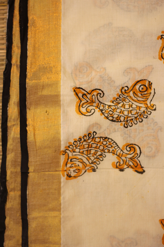 A Kasavu dupatta, traditionally known for its elegant simplicity and golden border, is transformed into an extraordinary piece with the addition of striking fish patterns. The classic appeal of the Kasavu's golden edge remains intact, providing a refined foundation that beautifully contrasts with the vibrant, intricate fish motifs printed across the fabric. These patterns, which can range from whimsical and playful to intricate and detailed, introduce a dynamic, aquatic theme that breathes new life into the traditional design. The interplay between the luxurious golden border and the lively fish prints creates a visually stunning effect, resulting in a dupatta that is not only a testament to traditional craftsmanship but also a modern work of art. This fusion of cultural heritage with imaginative, contemporary design makes the dupatta a captivating accessory that enhances any outfit with its unique and artistic flair.