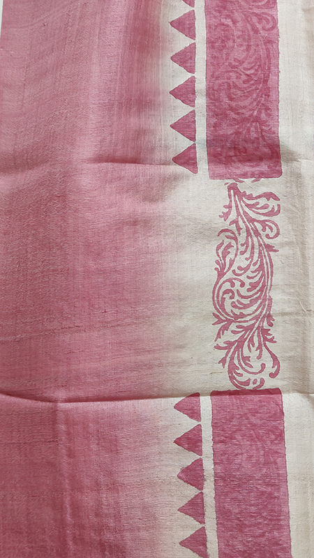 This is a tussar silk stole that has been hand dyed by artisans of Bengal and also hand block printed with beautiful geometric blocks.