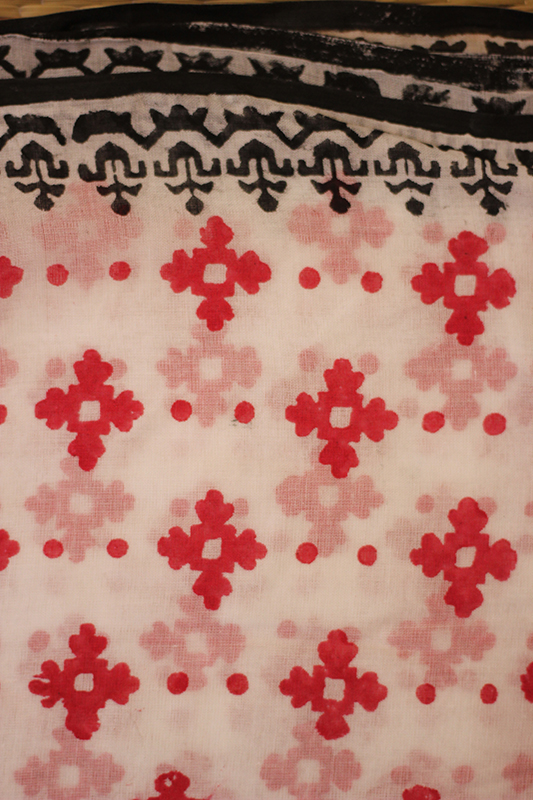 A mulmul dupatta embellished with block prints of geometric designs in vibrant red and stark black exudes a striking modernity while honoring traditional craftsmanship. The fabric, known for its airy, lightweight quality, serves as the perfect canvas for the bold interplay of colors and patterns. The geometric designs—precisely stamped with wooden blocks—create a captivating contrast against the soft, flowing mulmul. Red and black interplay in sharp, eye-catching motifs, offering a dynamic visual impact that blends the timeless elegance of traditional art with a contemporary edge. This dupatta, with its distinctive design, not only enhances the wearer's outfit but also stands as a statement piece of art, embodying a sophisticated fusion of heritage and modern style.
